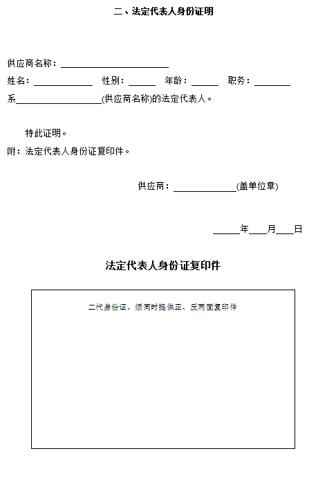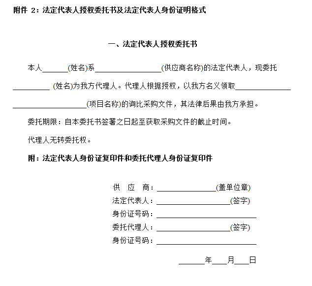 3.法定代表人现场领取纸质版采购文件的,提供法定代表人身份证明原件及身份证原件(格式见附件2);委托代理人现场领取纸质版采购文件的,提供法定代表人授权委托书原件、法定代表人授权代表人身份证原件(格式见附件2)。