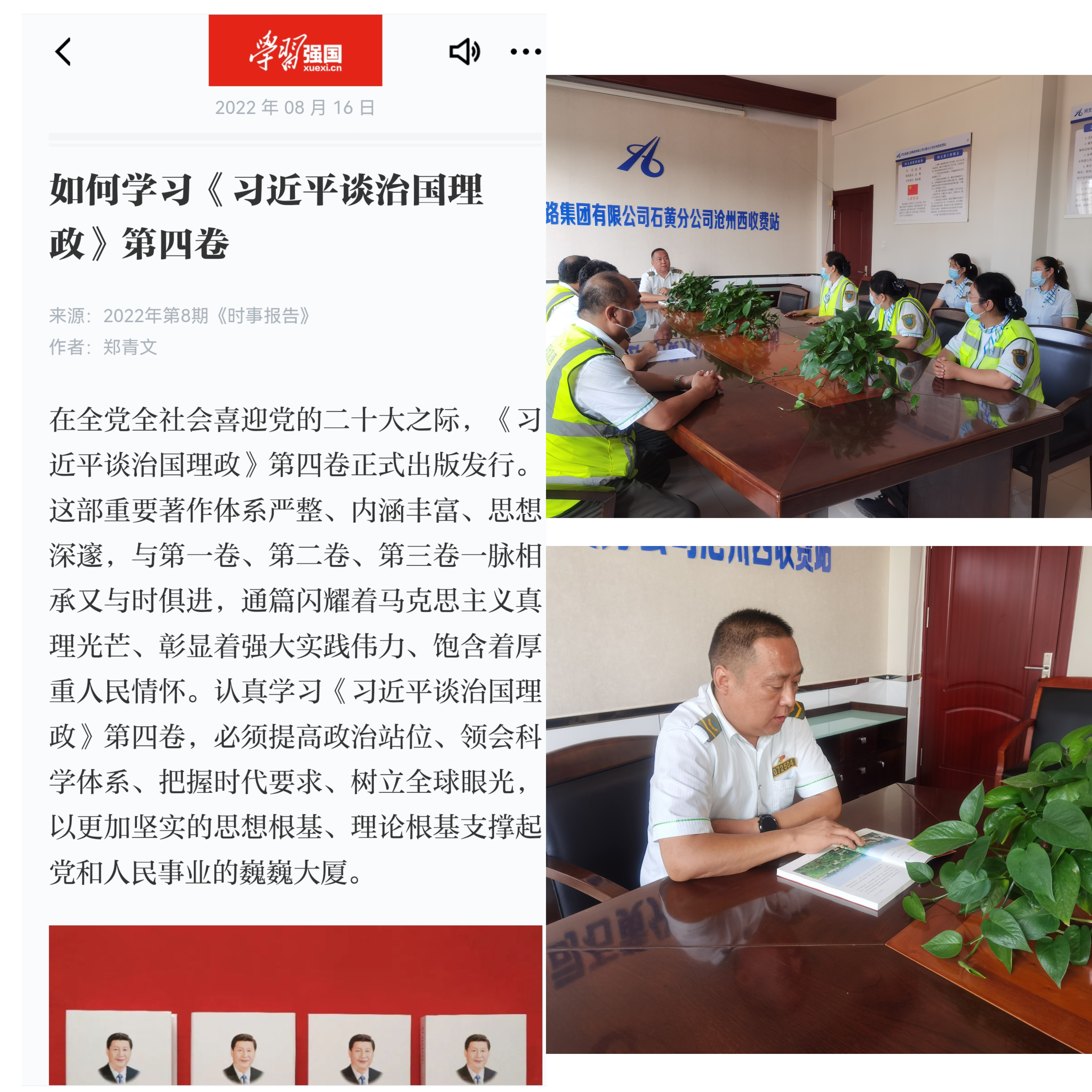 近日,石黄分公司党委向各党支部发放了《习近平谈治国理政》第四卷一书,沧州西收费站党支部高度重视、精心部署,迅速在全站掀起学习热潮。