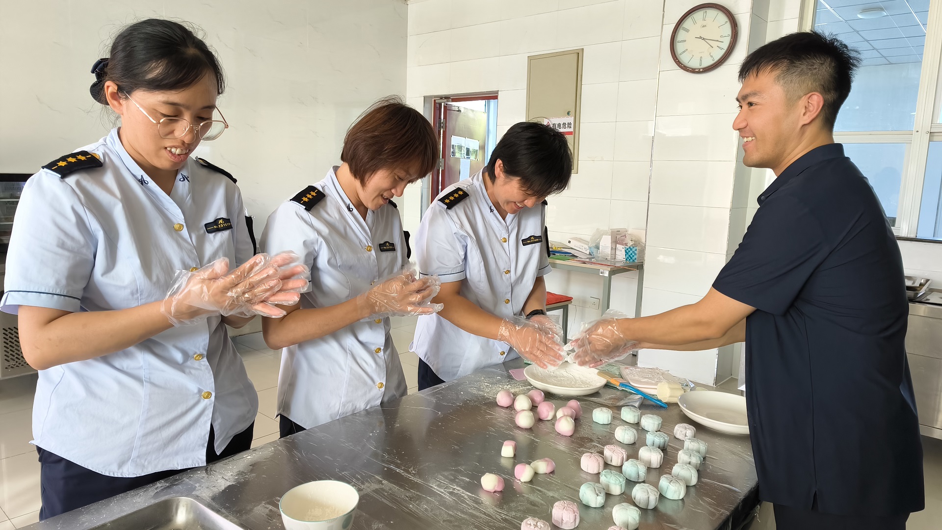 活动中,大家热情高涨,纷纷卷起袖子参与到制作月饼的过程中,从和面、擀皮、拌馅、称重、压花、成型、烘烤,每一步都认真细致,并互相交流制作心得。现场充满了欢声笑语,大家不仅学会了月饼制作技艺,更在团队合作中加深了彼此的情谊。经过一上午的努力,一个个香气扑鼻的月饼新鲜出炉。看着自己亲手制作的月饼,职工们的脸上都洋溢着满足和自豪的笑容。