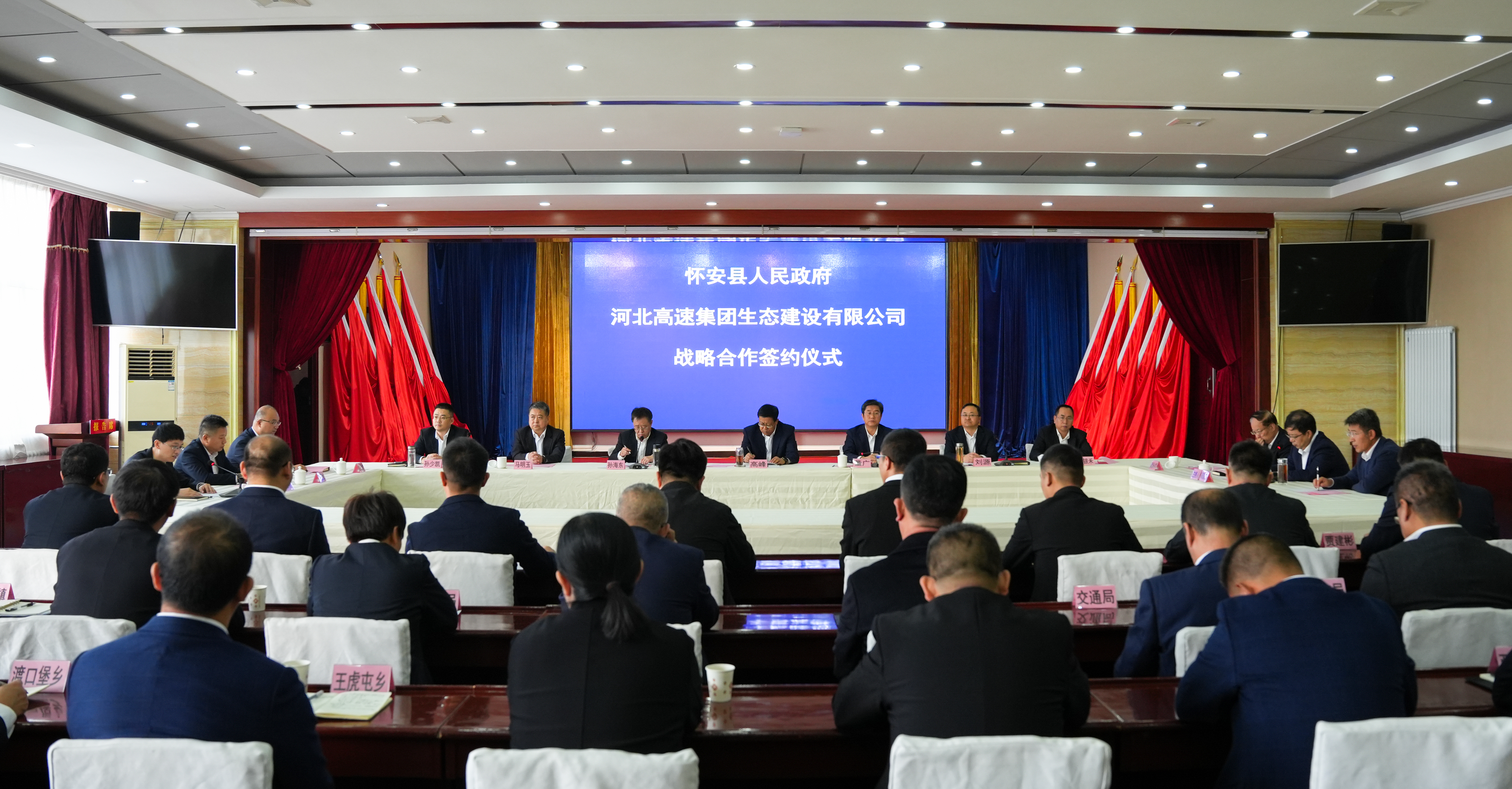 10月25日,河北高速集团生态建设有限公司与怀安县人民政府在怀安县宾馆举行了战略合作签约仪式。张家口市政协党组书记、主席高峰,张家口市人大副主任孙海东,河北高速集团党委副书记、董事、工会主席董广,张家口怀安县县委书记刘源,生态建设公司党支部书记、董事马明玉出席签约仪式。怀安县县长孙少凯与生态建设公司总经理焦银禾分别代表双方签署了《战略合作框架协议》及《土地整治(占补平衡)项目合作协议》。怀安县副县长高志宏主持签约仪式。