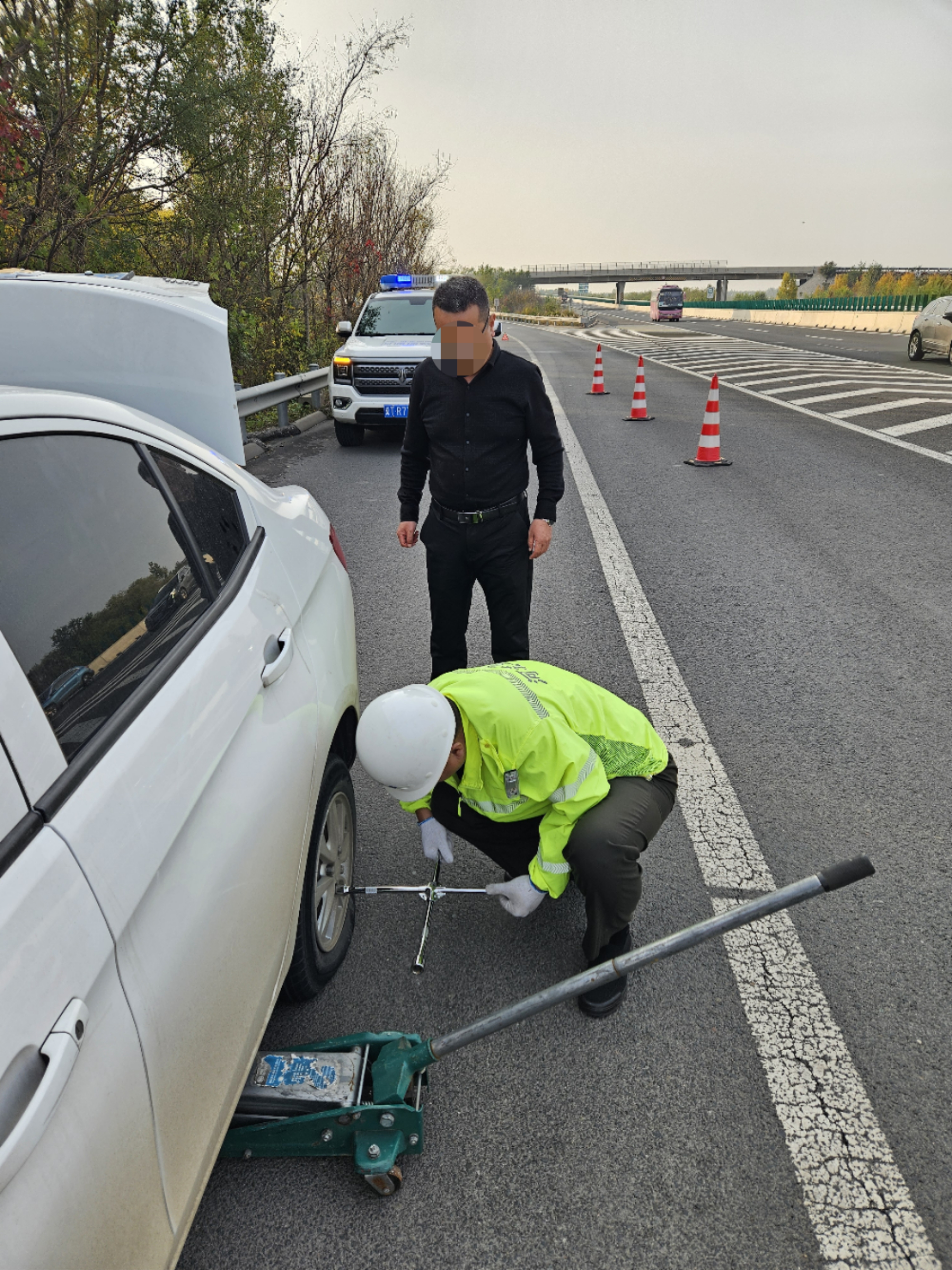 11月2日,邢衡衡水分公司指挥调度中心庞家村外业中队巡查过程中发现一辆白色轿车轮胎爆胎停靠在应急车道,打着双闪,司机在一旁焦急徘徊,十分危险。