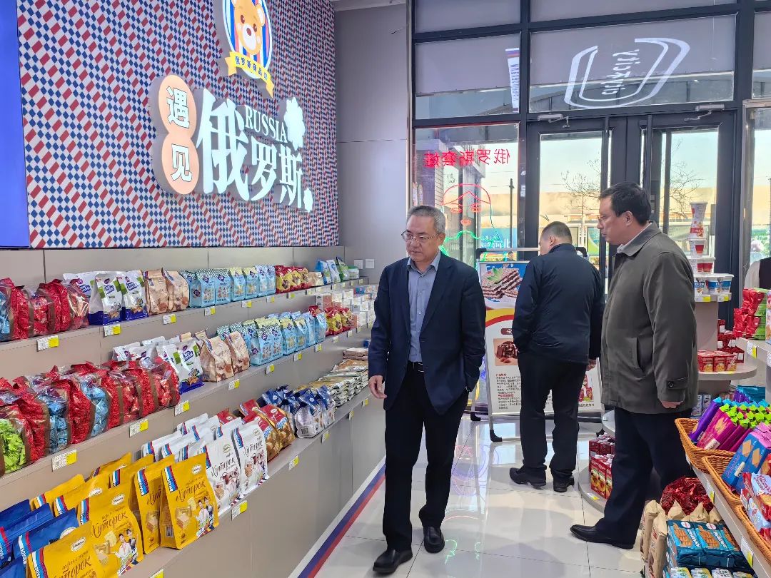 张建公现场查看了服务区基础设施维护和公共卫生间环境卫生情况,了解了服务区各经营业态运营管理状况和经营数据,对服务区充电桩建设布局、光伏发电、中水大棚后期规划以及超市俄罗斯商品专区销售等情况进行调研。