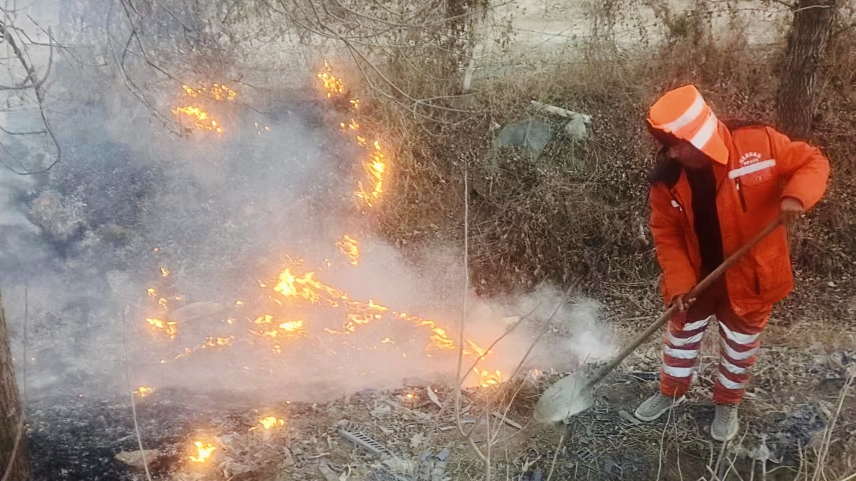 1月17日,正值春运期间。17时10分,衡水分中心饶阳养护队人员完成坑槽修补任务返回途中行驶至大广高速北京方向K1498公里处发现边沟边坡起火,火势迅猛,浓烟滚滚。为保障路面安全畅通,养护人员迅速响应,立即在应急车道设置警示标志,提醒过往车辆减速慢行。同时,随车养护人员快速穿戴好安全帽、防护服和防护手套,拿起铁锹,就地取材通过土埋方式进行灭火行动。