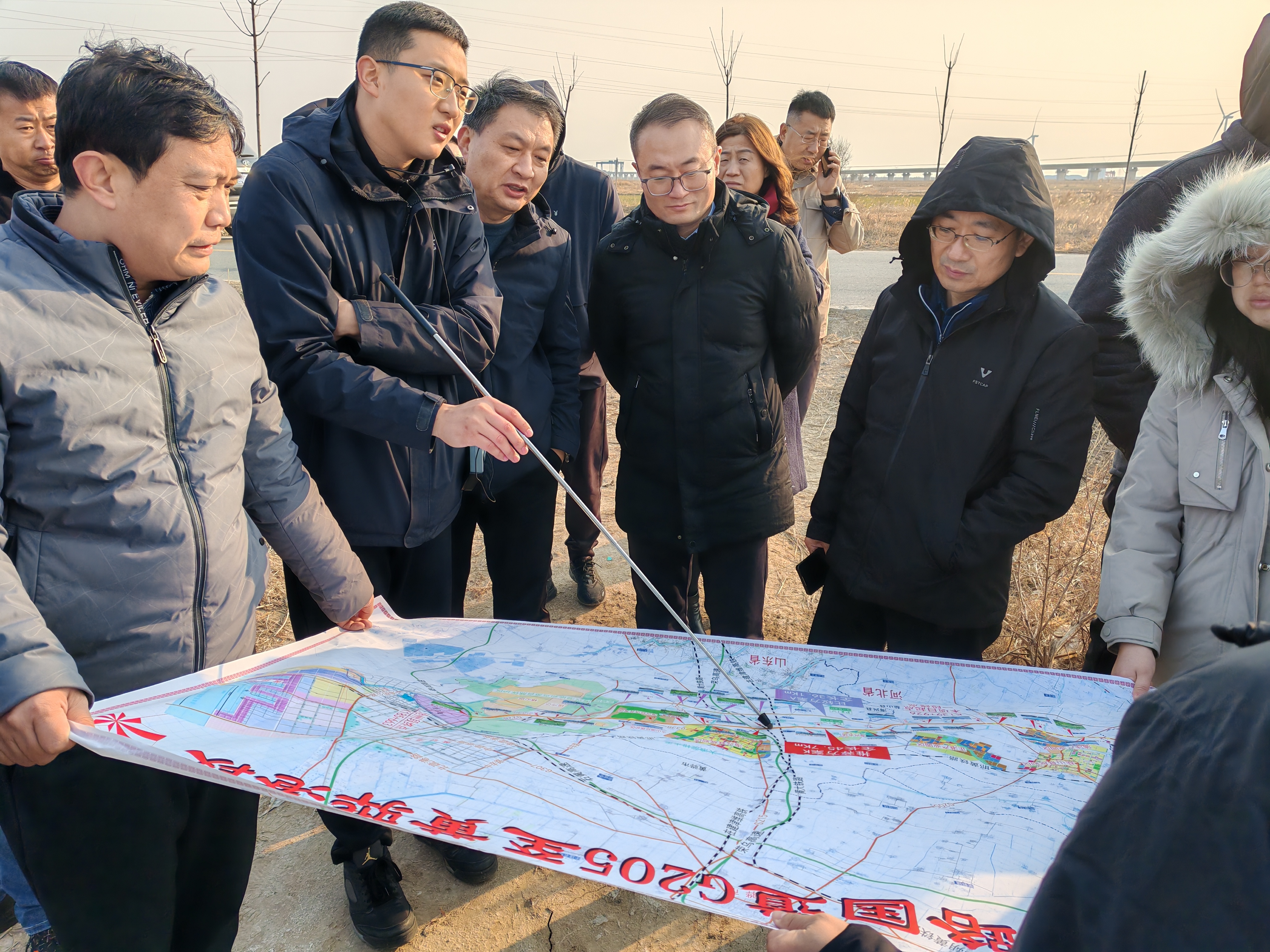 1月22日,专家组一行赴现场对项目全线进行了实地调研,重点踏勘了项目起点、常丰枢纽互通、黄大铁路及在建津潍高铁交叉位置、项目终点(与秦滨高速相交的青锋枢纽互通)等关键工点,同时,省规划设计院对枢纽互通、交叉工程等重点路段的方案进行了现场讲解。