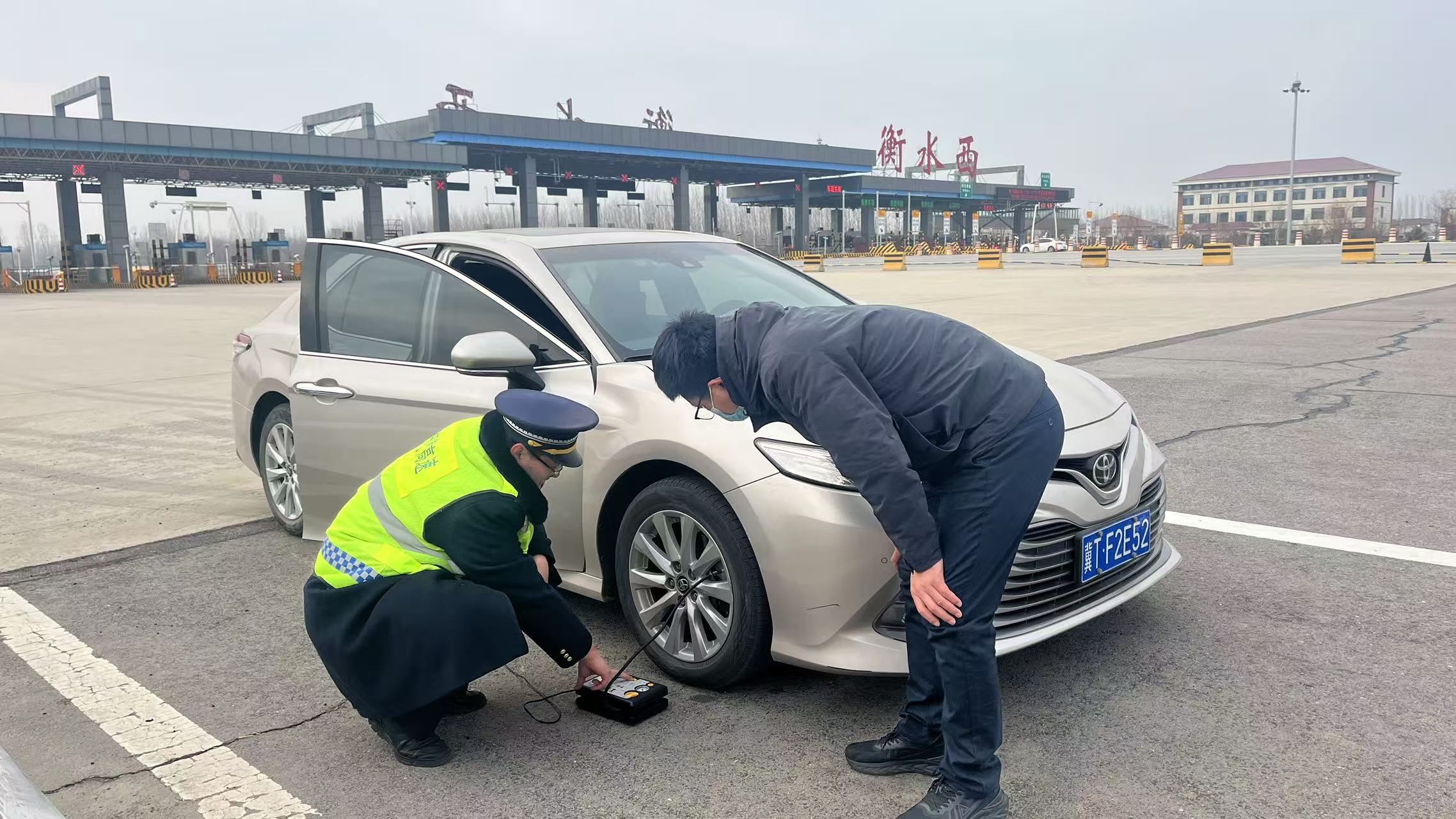 下午15时,衡水西站职工正在有条不紊地进行着收费、引导等工作。就在这时,一辆汽车缓缓停靠在收费站旁,司机面露焦急之色。经询问得知,车辆轮胎出现了亏气问题,无法继续正常行驶。了解情况后,收费员们迅速行动,一边安抚司机的情绪,一边拿来自己车上的电动气筒,熟练地为车辆轮胎打气。在大家的共同努力下,轮胎很快就恢复了正常气压,司机的脸上也露出了满意的笑容。