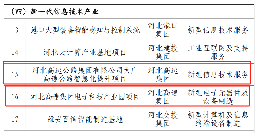 近日,河北省国资委公布了《河北省国资委监管企业战略性新兴产业示范企业和示范项目(2024 年)》名单,河北高速集团大广分公司申报的《开云电子开云电子首页大广高速公路智慧化提升项目》,河北高速集团资源开发运营有限公司申报的《河北高速集团电子科技产业园项目》获评战略性新兴产业示范项目。