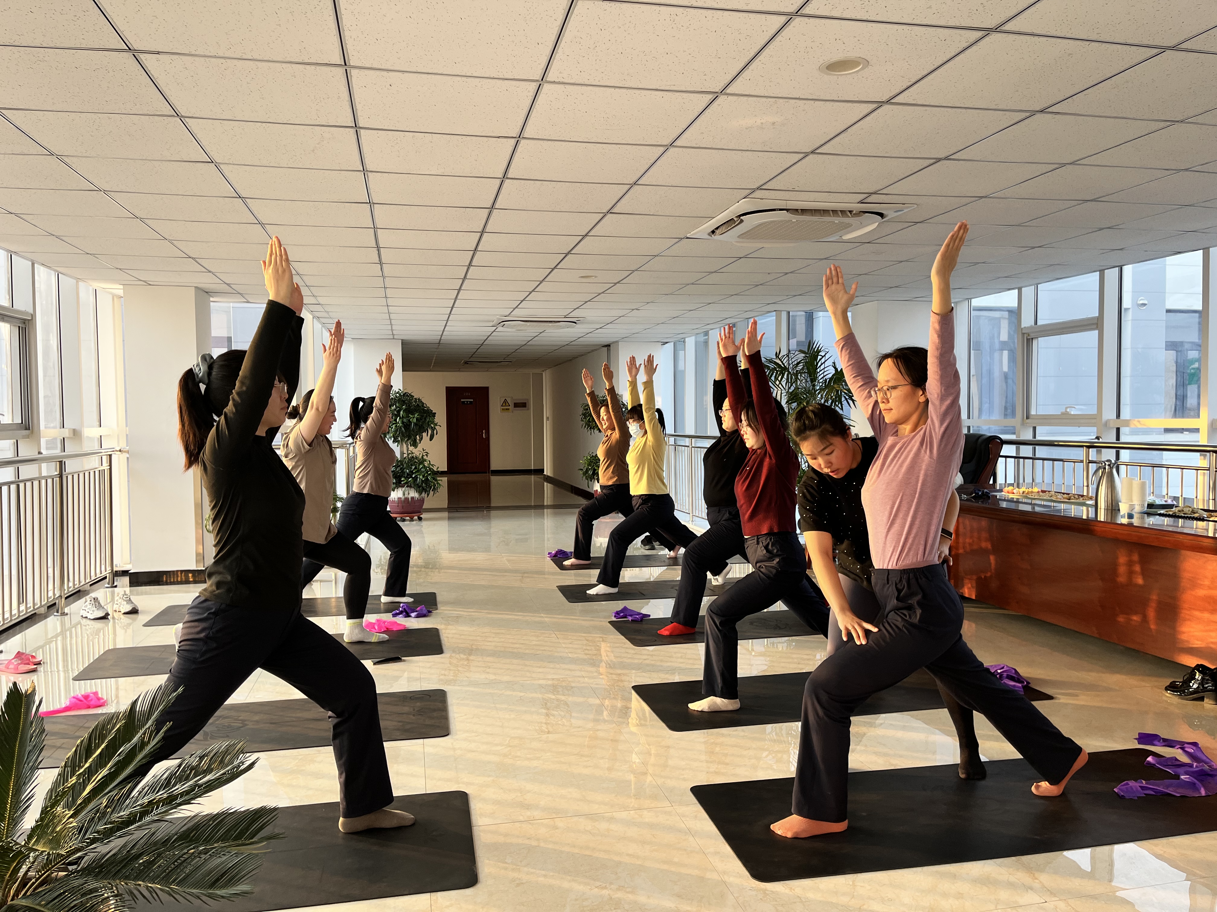伴随着轻松舒柔的音乐,女职工们在瑜伽老师的指导下,学习正确有序的呼吸、拉伸、冥想,大家专注地调整呼吸,跟随老师的指令,在动与静的结合中,察觉身体变化、感知内在力量,释放心中的压力,畅享瑜伽带来的身心滋养。经过一个小时的练习,女职工纷纷表示收获颇多。“平日里,工作和家庭占据了我大部分的时间,这次活动给我提供了一个放松身心、缓解压力的平台”“和姐妹们一起做瑜伽太开心啦,平时因为工作久坐,肩膀一直不舒服,现在我整个人轻松多了!”