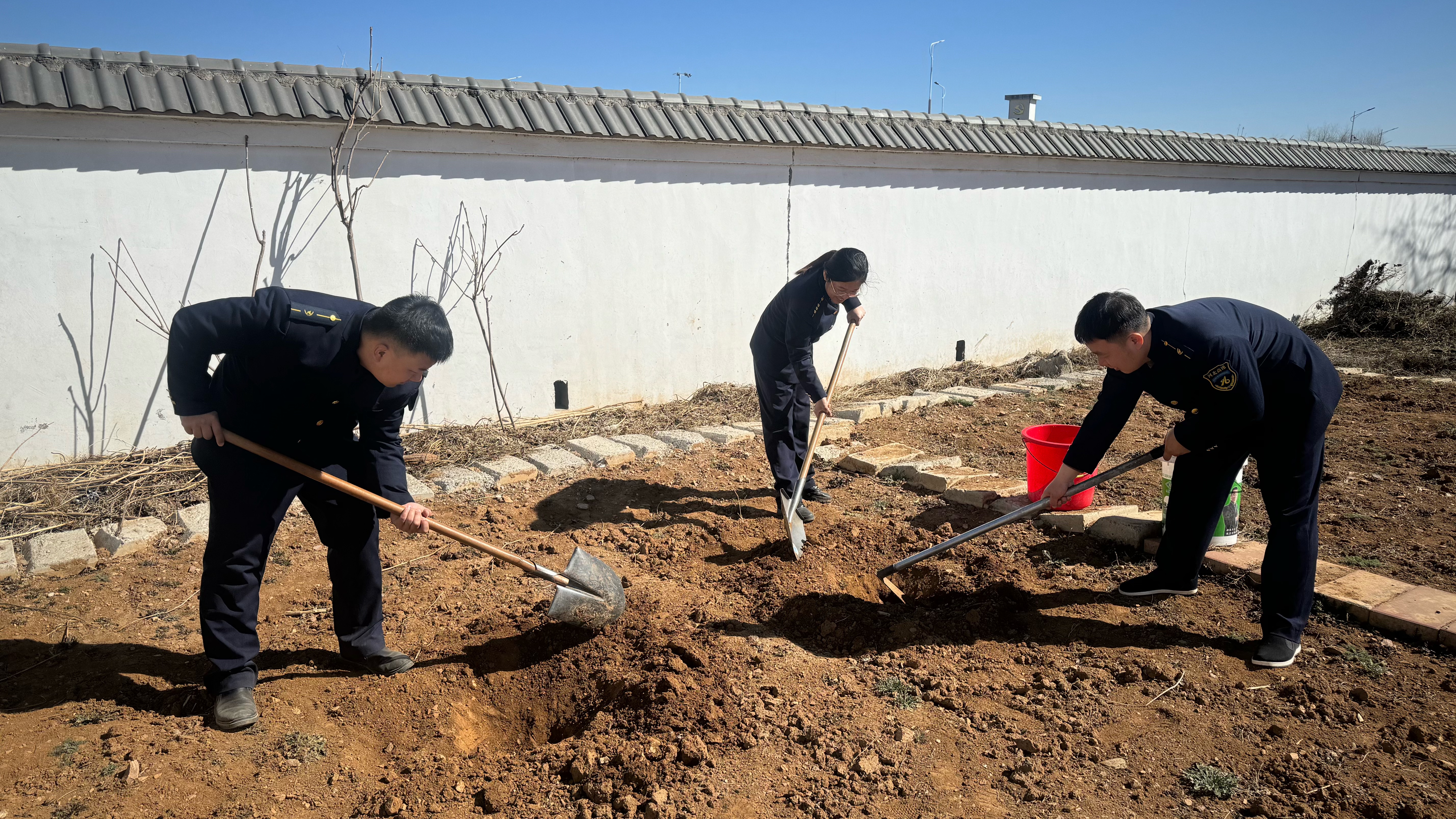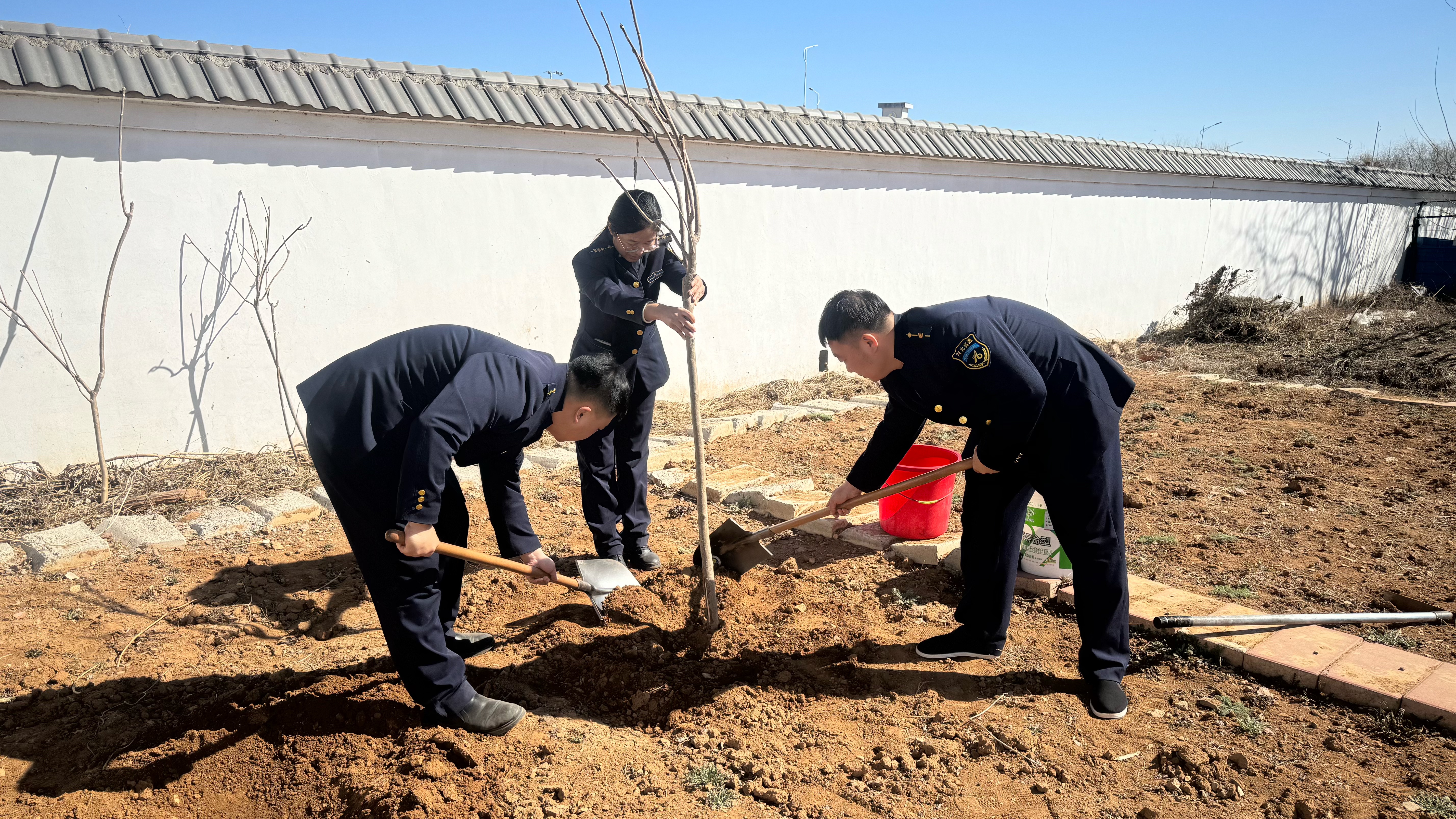 植树现场,志愿者们分工协作,默契配合。有人挥锹铲土,有人扶苗对齐,还有人提水浇灌,经过一个多小时的努力,8颗树苗全部种植完毕。一颗颗树苗昂然挺立,错落有致,在和煦的春风里显露勃勃生机。