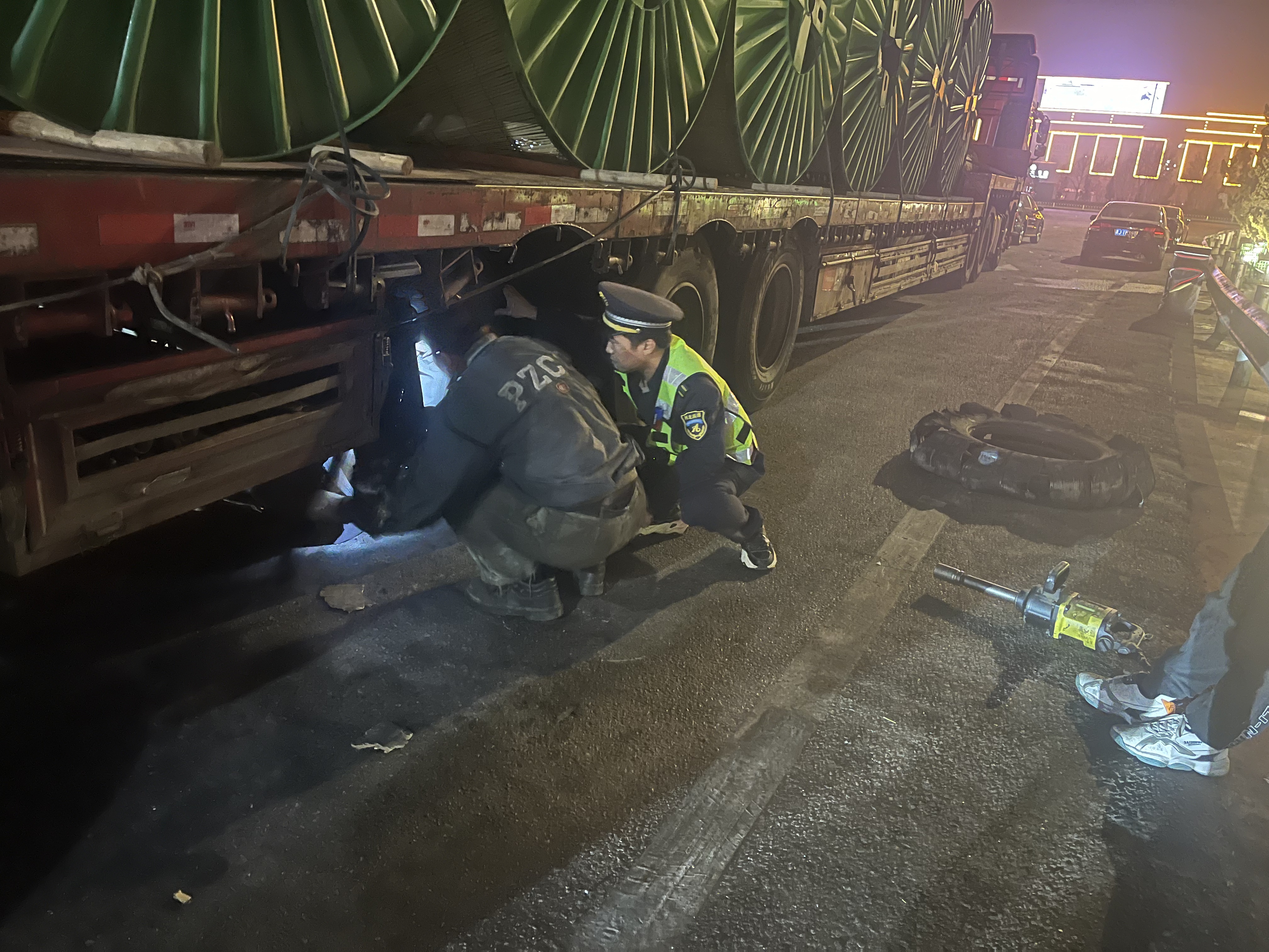 4月8日晚上22:00左右,京沪分公司青县站收费一班班长解彦龙发现收费站外广场一辆六轴大货车打着双闪停了很久。解彦龙猜测可能是出了故障,便赶到现场询问情况。经过一番了解后,原来是大货车轮胎爆了,由于缺少修车工具,司机师傅无法自行更换轮胎,急得满脸愁容。