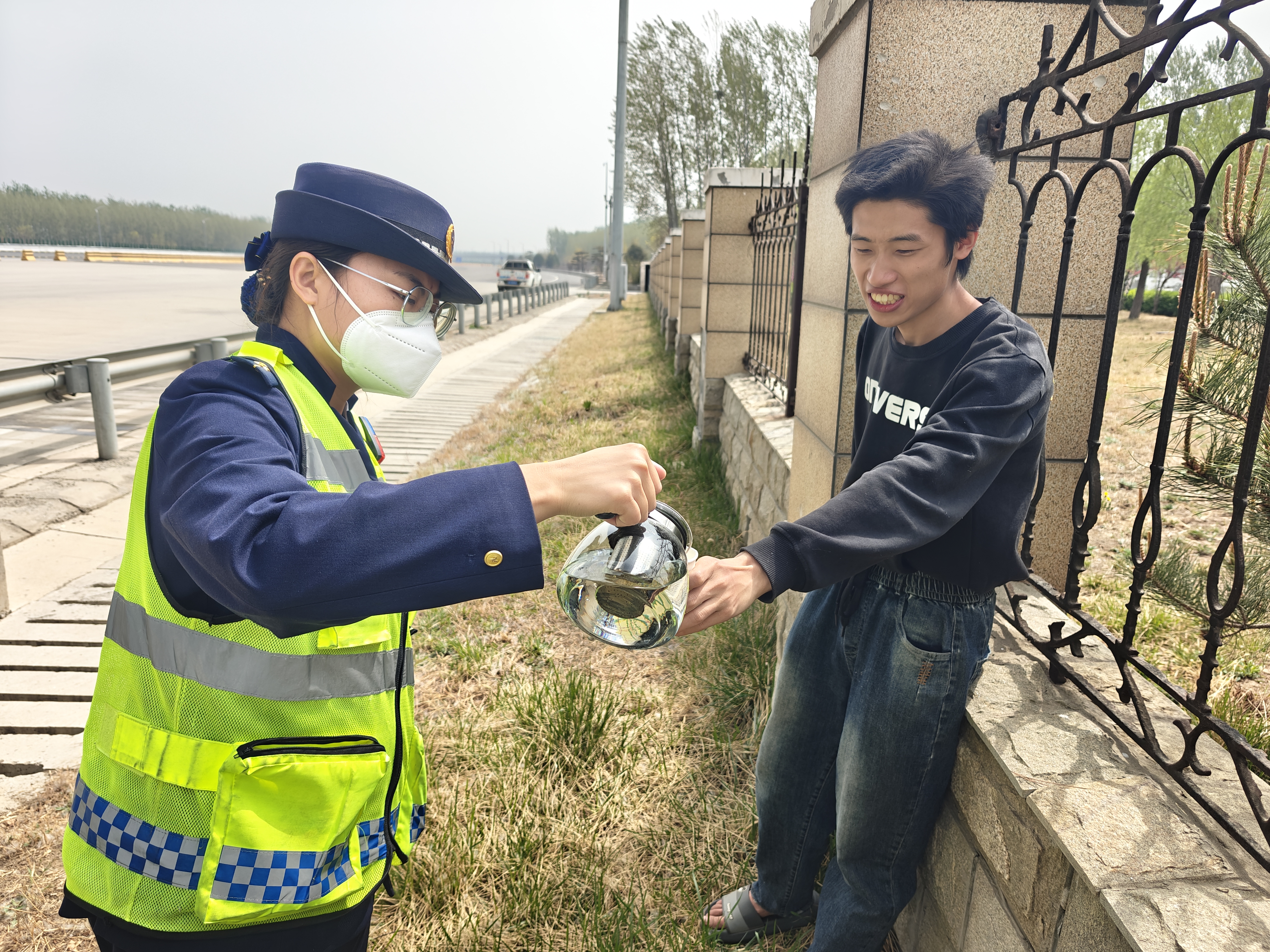 4月13日,当班班长进行日常巡检时发现,收费站出口广场护栏旁有一个男子正在向收费车道走去。班长立即上前制止男子这一危险行为。