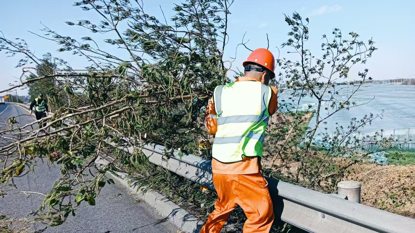 闻“风”而动,吹响抢险“集结号”。险情就是命令!养护分公司迅速启动恶劣天气应急预案,与高速交警、路政、路段分公司强效联动,上午7时许,G2京沪高速、G1811黄石高速分别出现了防落物网破损、树木倾倒等情况,所属养护队立即按照“先通后畅、安全优先”原则,展开抢修,养护队员们顶风冒沙,与时间赛跑,全力抢通保畅。