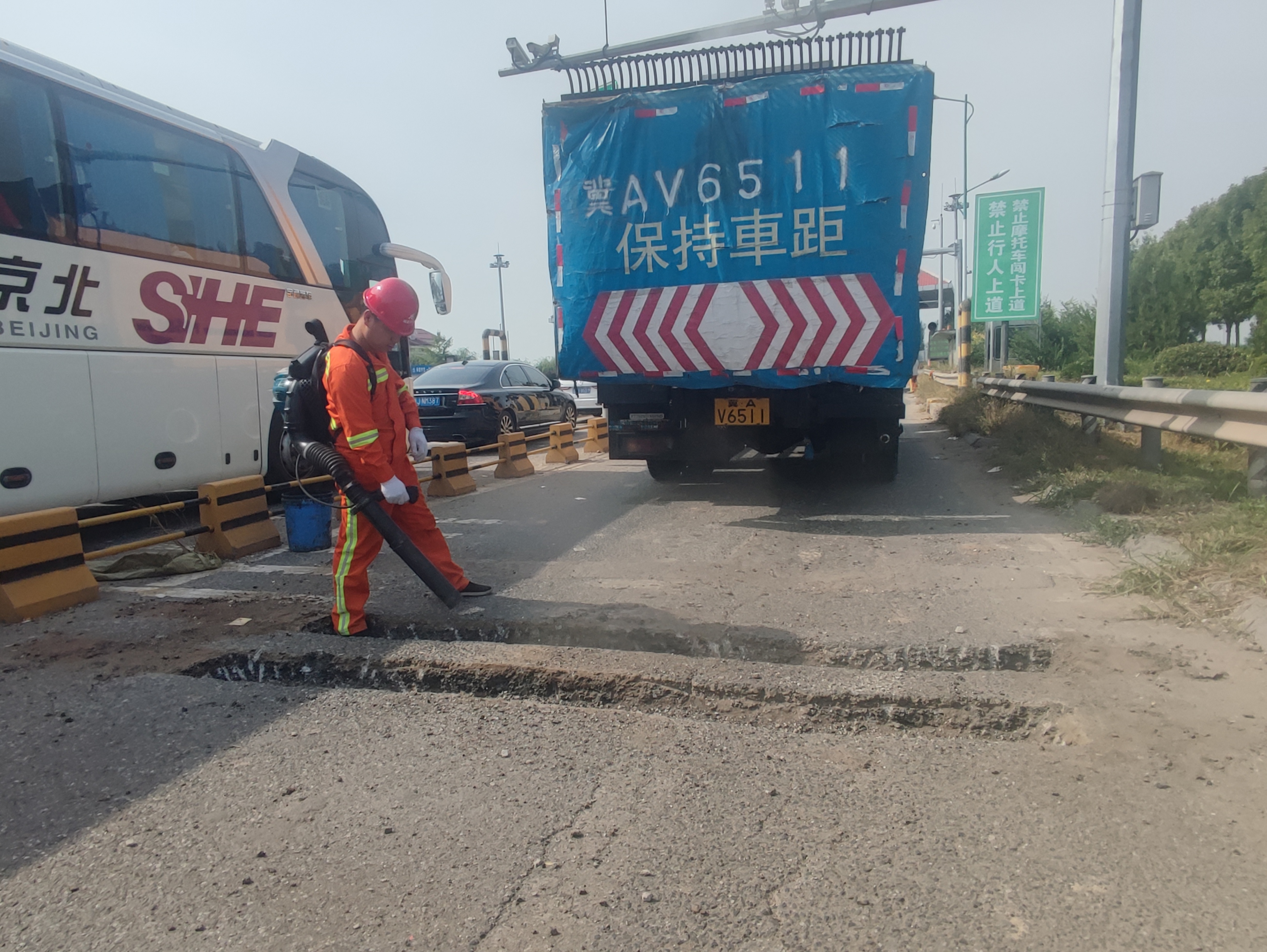10月1日,正值中秋国庆双节叠加出行高峰期,衡水分中心饶阳养护队接到大广饶阳养护班组派工单,大广高速公路肃宁收费站外广场计重车道附近,路面出现坑槽损坏面积已超30㎡,若不及时处置,将严重影响节日期间货运及过往车辆通行安全。