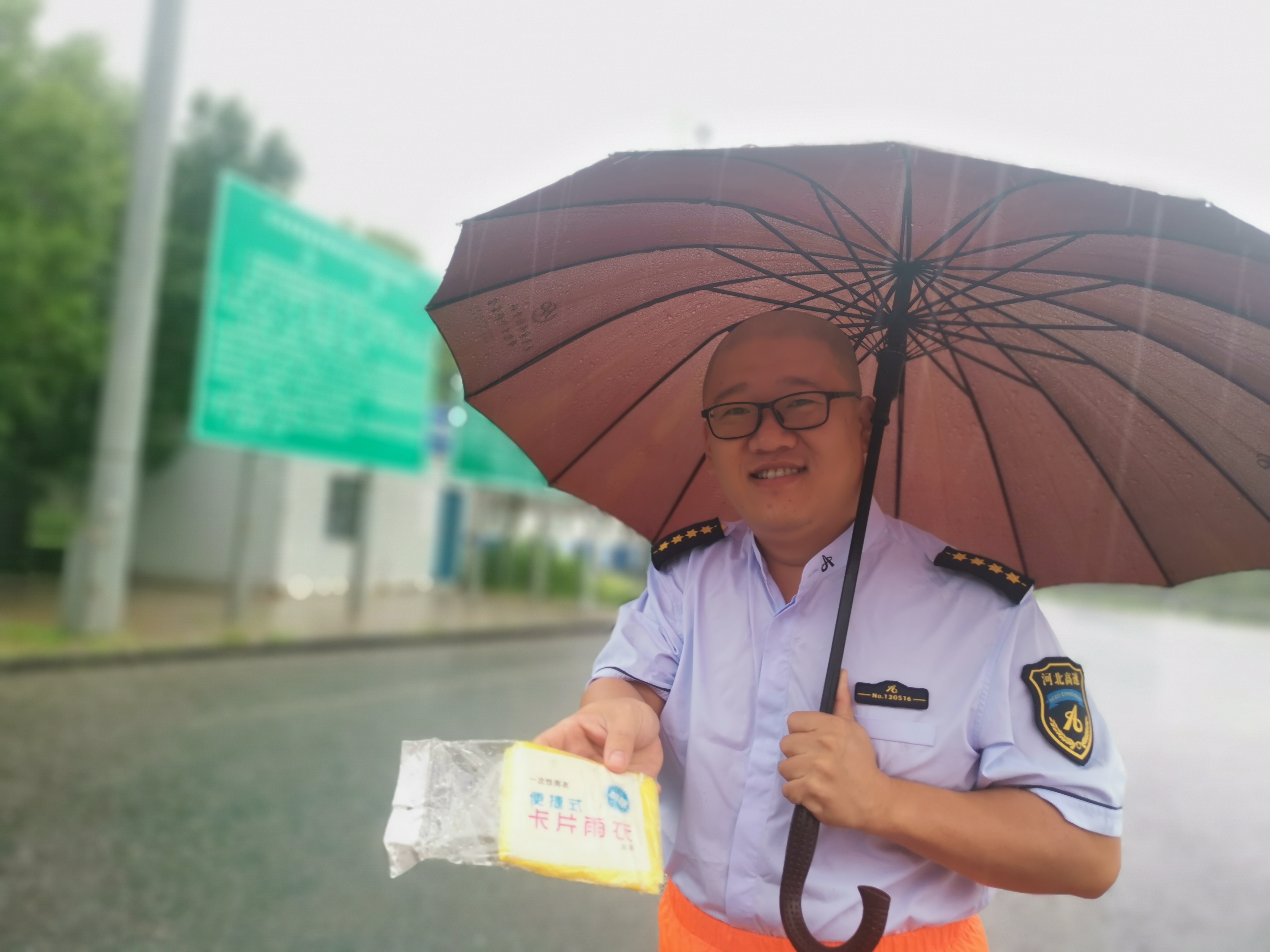 司机送给暴雨下疏导车辆的人员一些雨衣和雨伞,对收费广场上的工作人员表示感谢。(摄影:王芳 郑亚敬)