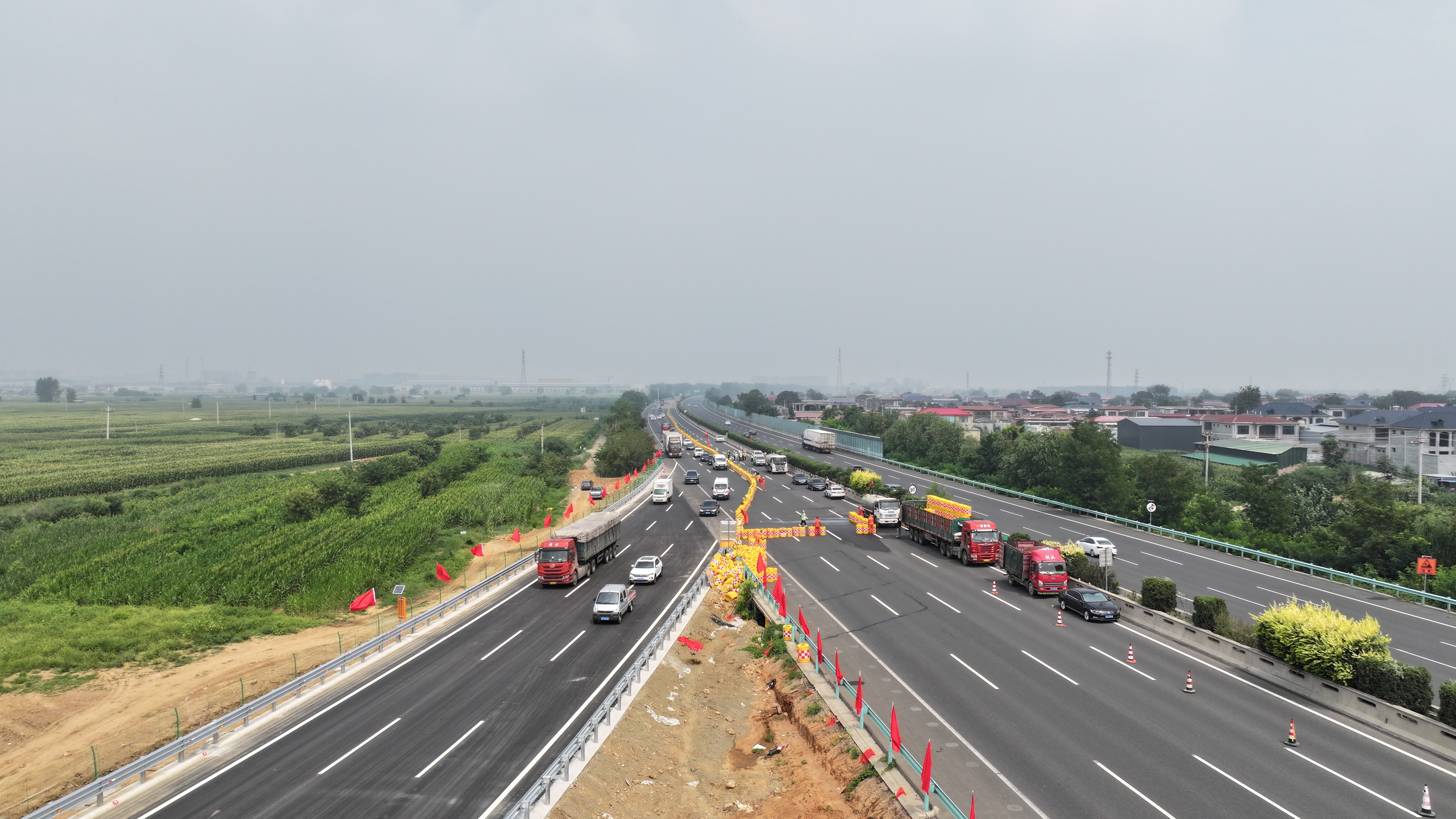 8月7日11时,随着最后一组交通反光桶完成布设,京港澳高速新增永年北互通交通导改工作顺利落地,安阳方向行驶车辆全部平稳驶入新建导改车道,K409+300至K410+400路段正式进入半幅封闭施工状态。这一关键节点的顺利达成,为项目控制性工程AK0+851.73匝道大桥上跨京港澳高速公路施工开辟了作业空间,标志着该项目建设迈入实质性攻坚阶段。