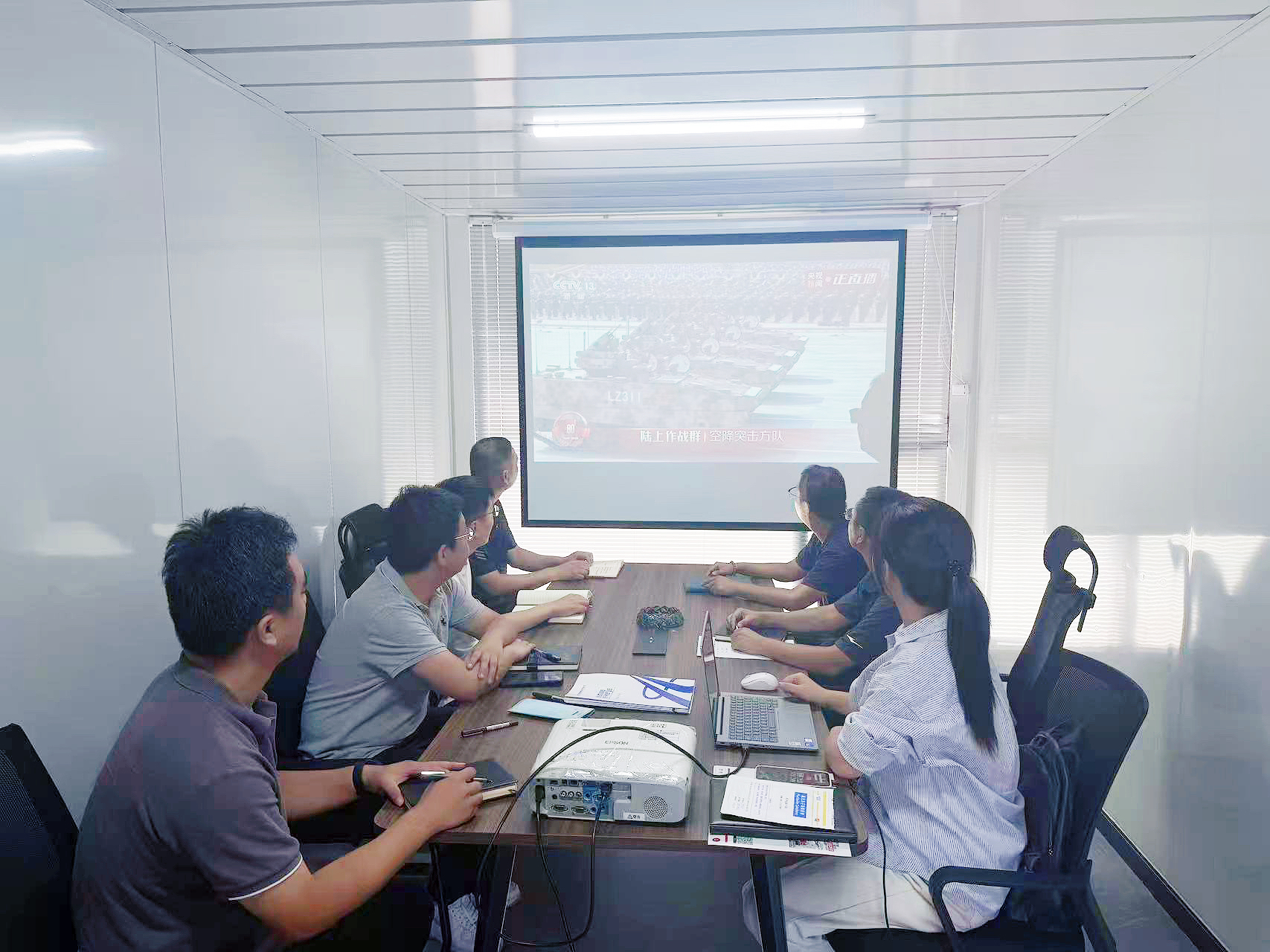 会议室内气氛庄重热烈,习近平总书记的重要讲话震撼人心,天安门广场上铿锵的步伐和嘹亮的口号激发一腔热血,大家神情专注,时而爆发出雷鸣般的掌声,时而跟随现场的氛围摇旗欢呼,心中激荡着对抗战英雄的无限敬仰与缅怀和对实现中华民族伟大复兴的坚定信心和决心。